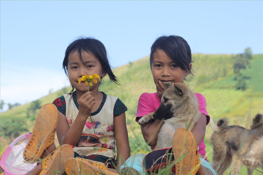 | Những đứa trẻ ngây thơ nô đùa dưới chân núi. Ảnh TA |