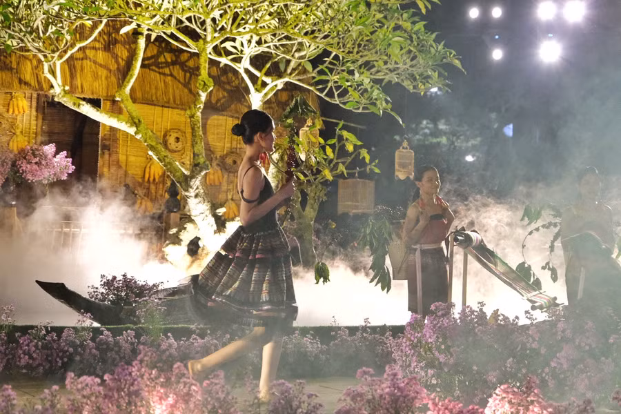 | Sắc màu thổ cẩm thăng hoa trên sân khấu. Ảnh: Hoàng Ngọc |