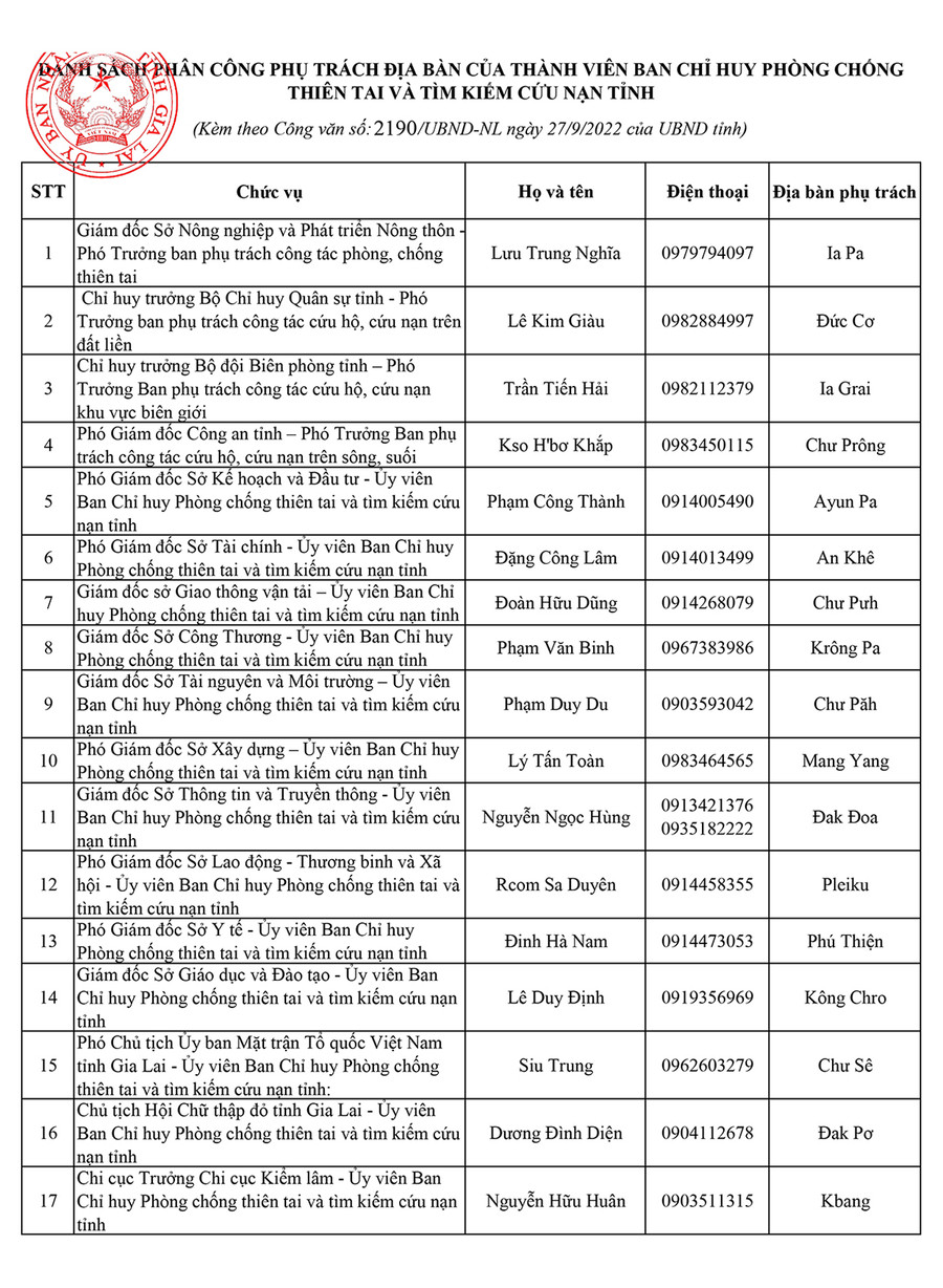 Theo đó, thực hiện Công điện số 865/CĐ-TTg ngày 27-9-2022 của Thủ tướng Chính phủ về tập trung ứng phó khẩn cấp với bão số 4 năm 2022 và Công văn số 857-CV/TU ngày 24-9-2022 của Ban Thường vụ Tỉnh uỷ về tập trung ứng phó khẩn cấp với bão số 4 năm 2022 trên địa bàn tỉnh; đồng chí Chủ tịch UBND tỉnh-Trưởng Ban Chỉ huy Phòng-chống thiên tai và Tìm kiếm cứu nạn (PCTT-TKCN) tỉnh yêu cầu các đồng chí là thành viên Ban Chỉ huy PCTT-TKCN tỉnh ngay lập tức xuống địa bàn được phân công phụ trách (theo Quyết định số 591/QĐ-BCH ngày 2-11-2021 của Trưởng Ban Chỉ huy PCTT-TKCN tỉnh (có danh sách cụ thể kèm theo) để trực tiếp chỉ đạo, đôn đốc kiểm tra công tác ứng phó tại cơ sở cho đến khi cơ bản khắc phục được hậu quả cơn bão số 4.