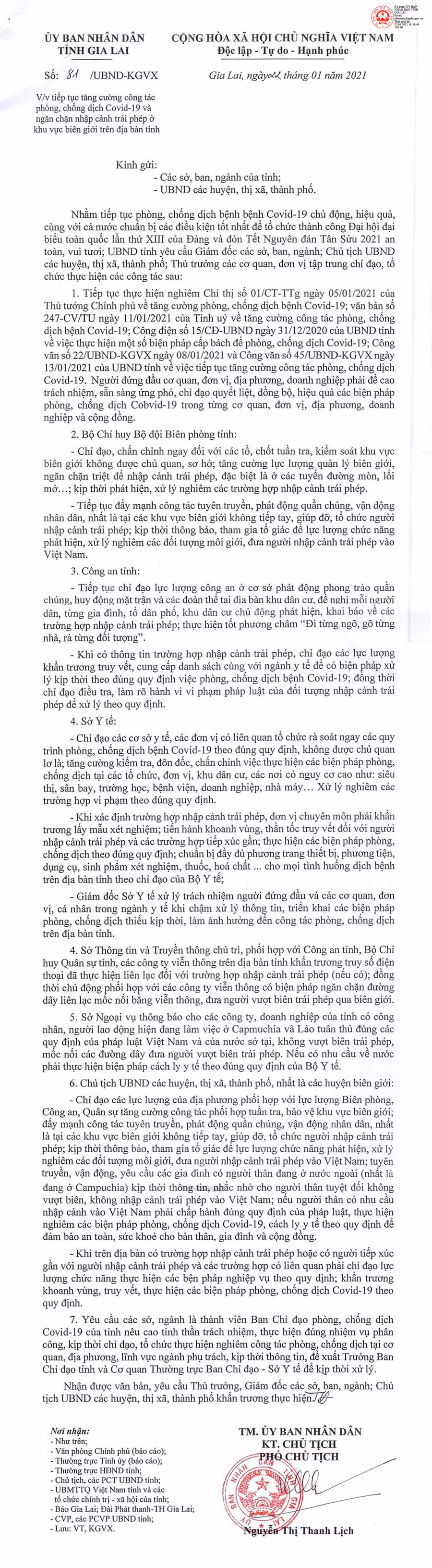 (GLO)- Ngày 22-1, UBND tỉnh Gia Lai có Công văn số 81/UBND-KGVX về việc tiếp tục tăng cường công tác phòng-chống dịch Covid-19 và ngăn chặn nhập cảnh trái phép ở khu vực biên giới trên địa bàn tỉnh.