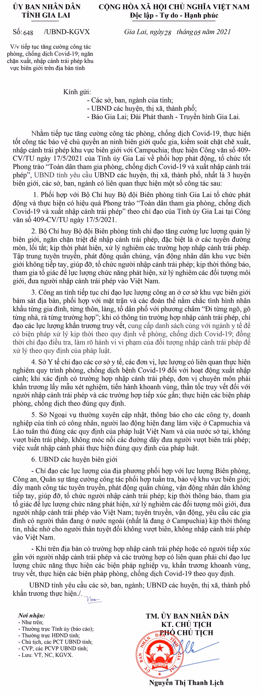 (GLO)- Ủy ban nhân dân tỉnh Gia Lai vừa có Công văn số 648/UBND-KGVX về việc tiếp tục tăng cường công tác phòng-chống dịch Covid-19 và ngăn chặn xuất nhập cảnh trái phép khu vực biên giới trên địa bàn tỉnh.