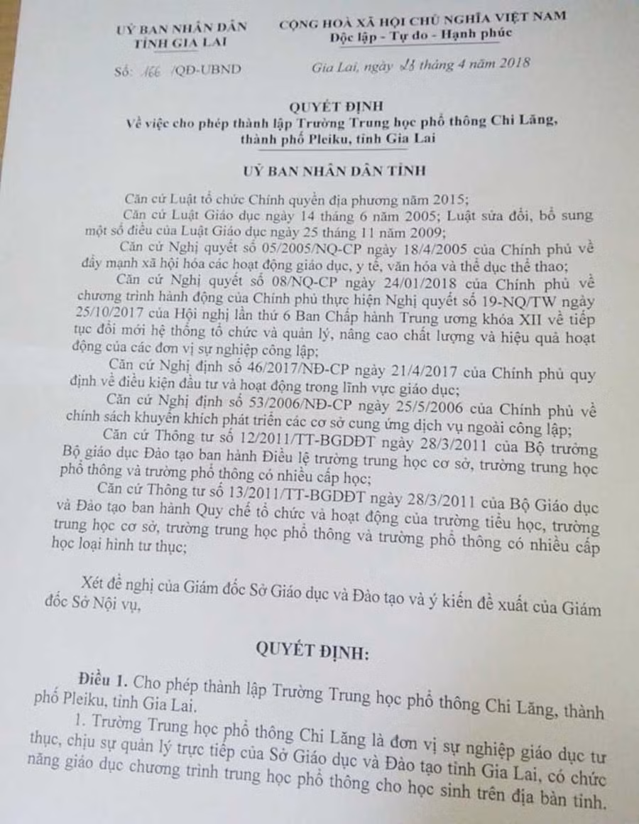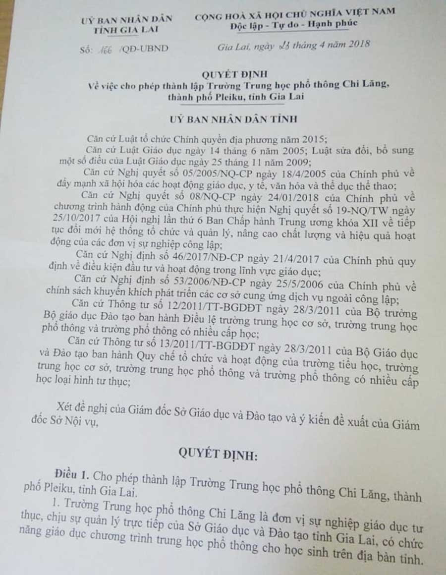 (GLO)- Ngày 23-4, Chủ tịch UBND tỉnh Võ Ngọc Thành đã ký Quyết định số 166/QĐ-UBND về việc cho phép thành lập Trường THPT Chi Lăng, TP. Pleiku, Gia Lai.