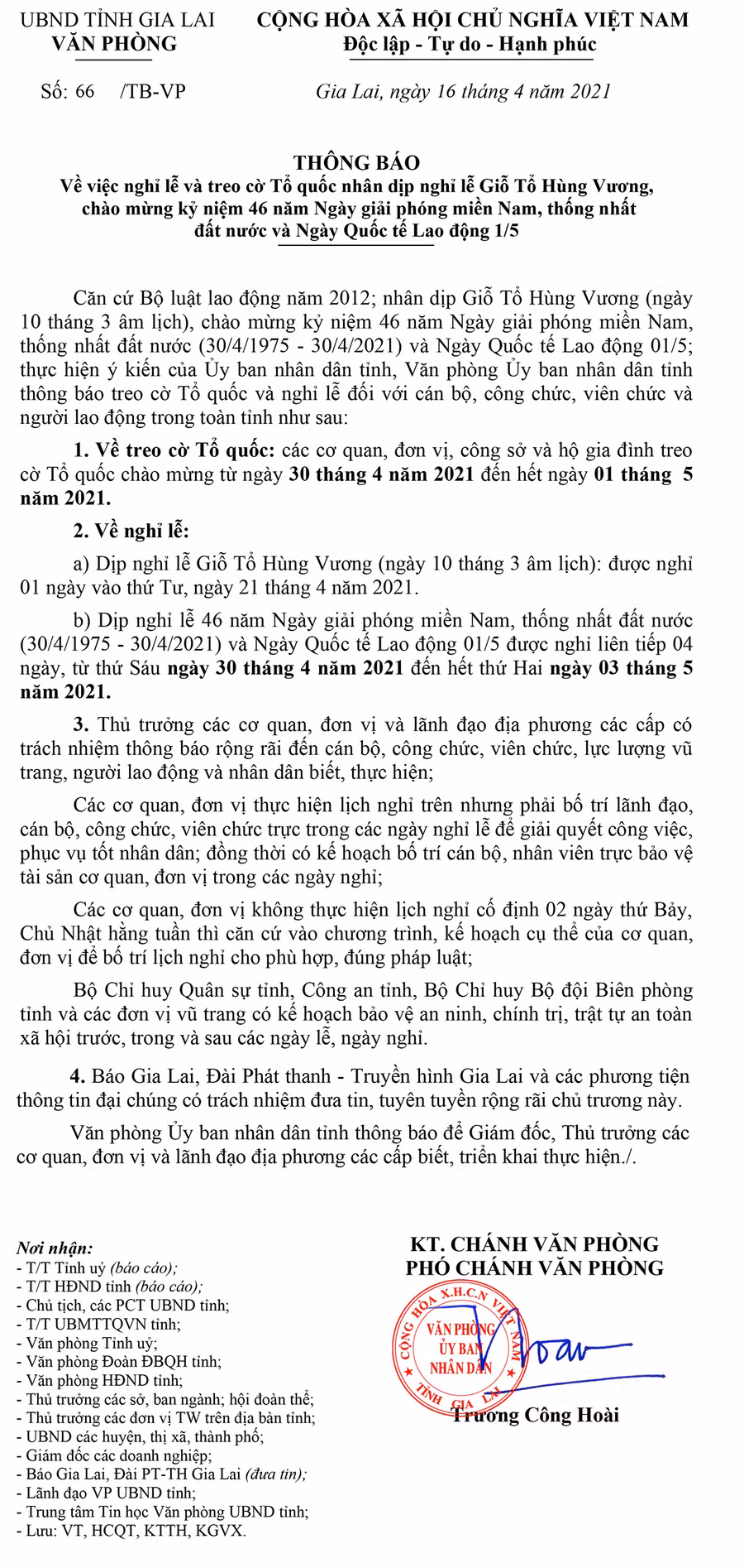 (GLO)- Ngày 16-4, Văn phòng UBND tỉnh Gia Lai có Thông báo số 66/TB-VP về việc nghỉ lễ và treo cờ Tổ quốc nhân dịp nghỉ lễ Giỗ Tổ Hùng Vương, chào mừng kỷ niệm 46 năm Ngày giải phóng miền Nam, thống nhất đất nước và Ngày Quốc tế Lao động 1-5.