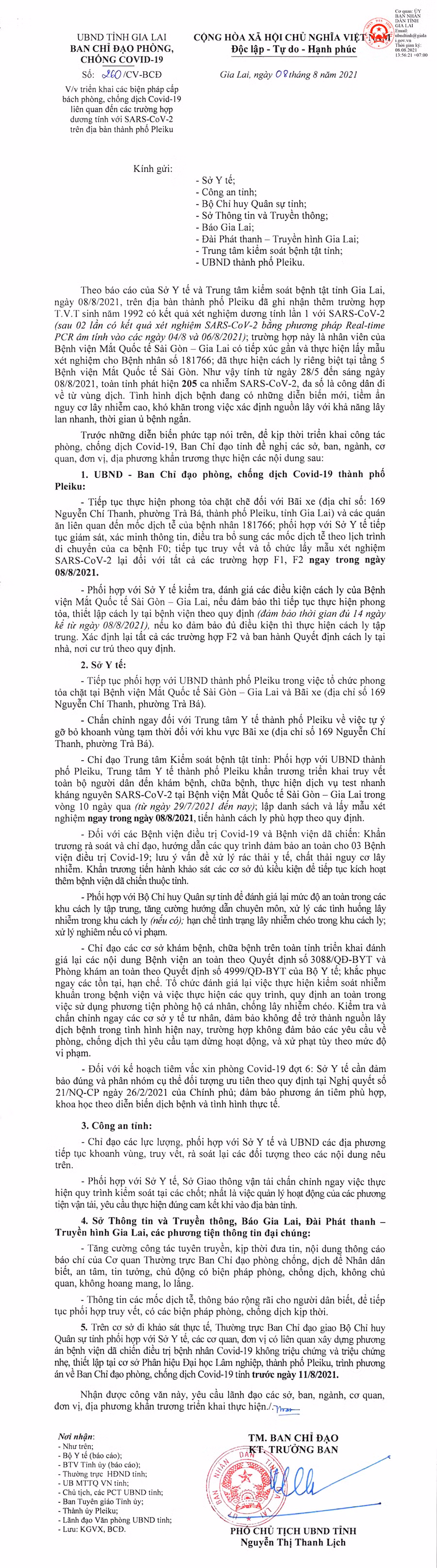 (GLO)- Ngày 8-8, Ban Chỉ đạo phòng-chống dịch Covid-19 tỉnh Gia Lai có Công văn số 260/CV-BCĐ về việc triển khai các biện pháp cấp bách phòng-chống dịch Covid-19 liên quan đến các trường hợp dương tính với SARS-CoV-2 trên địa bàn TP. Pleiku.