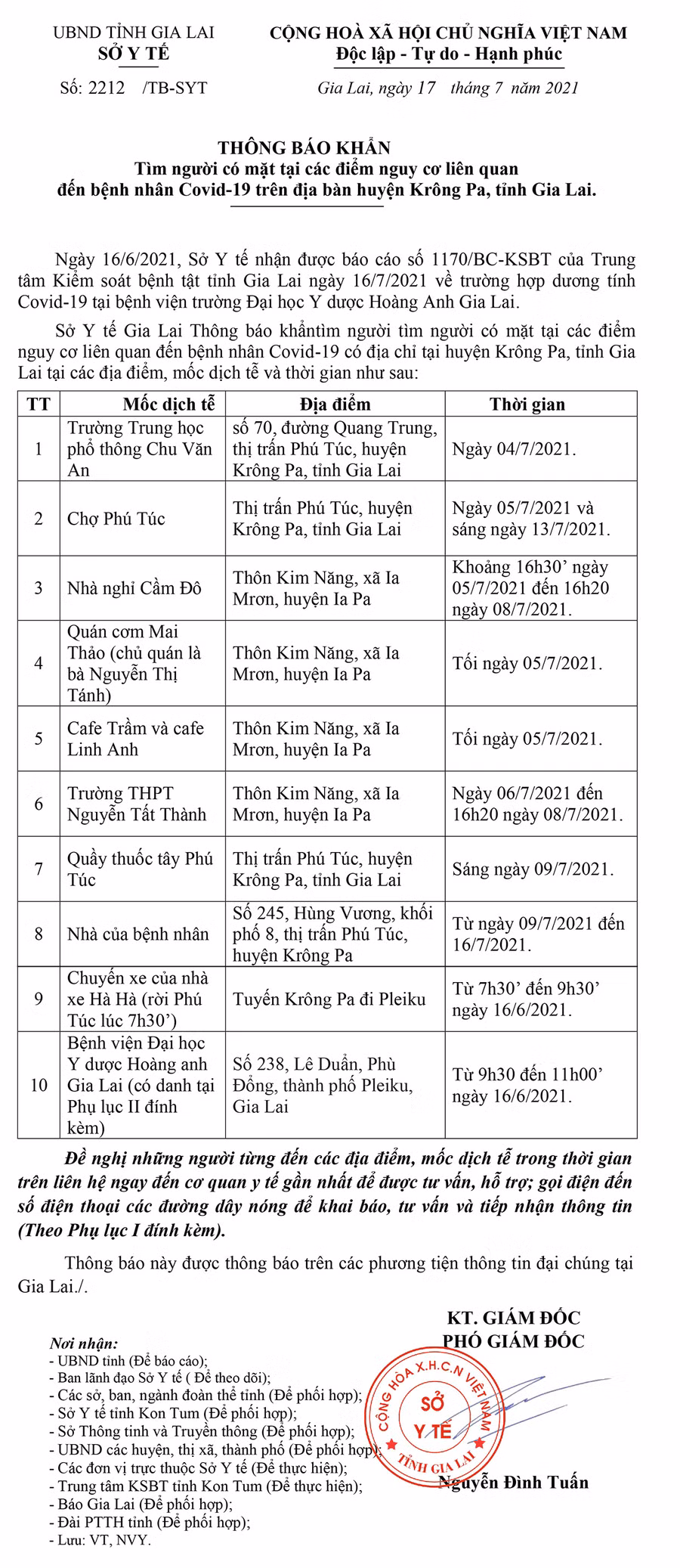 (GLO)- Ngày 17-7, Sở Y tế tỉnh Gia Lai có Thông báo khẩn số 2212/TB-SYT về việc tìm người có mặt tại các điểm có nguy cơ liên quan đến bệnh nhân Covid-19 trên địa bàn huyện Krông Pa, tỉnh Gia Lai.