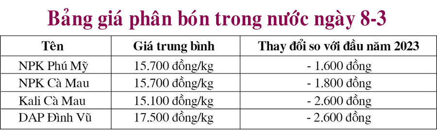 Trong khi đó, sau khi giảm 2.600 đồng/kg, giá phân bón Kali Cà Mau và DAP Đình Vũ lần lượt có giá 15.100 đồng/kg và 17.500 đồng/kg.