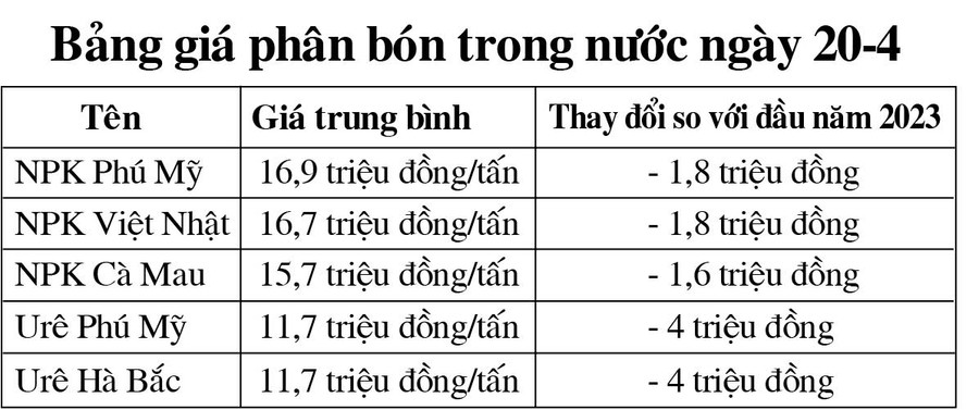 Hiệp hội Phân bón Việt Nam cho biết, từ đầu năm 2023 giá các loại phân bón trong nước liên tục giảm mạnh, đặc biệt là phân Urê. Hiện nay giá phân bón đã giảm đến 30%, cũng là mức thấp nhất trong vòng 2 năm trở lại đây. Điều này, giúp nông dân tích cực sản xuất trở lại sau quãng thời gian oằn mình thua lỗ vì giá phân bón tăng phi mã.