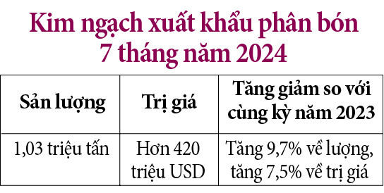Tính chung 7 tháng năm 2024, Việt Nam đã xuất khẩu hơn 1 triệu tấn phân bón các loại, trị giá hơn 420 USD (tăng 9,7% về lượng, tăng 7,5% về trị giá so với cùng kỳ năm 2023).