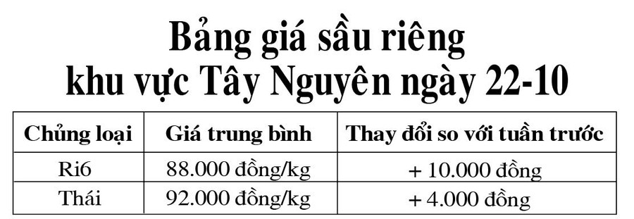 Cụ thể, sầu riêng Ri6 hàng loại 1 đang được thương lái thu mua với giá 88.000 đồng/kg (tăng 10.000 đồng); sầu riêng Thái hàng loại 1 đang được thu mua ở mức 92.000 đồng/kg (tăng 4.000 đồng).