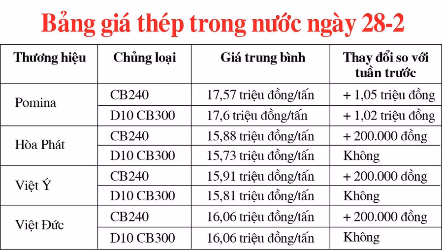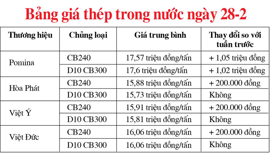 Theo đó, thương hiệu thép Pomina đã điều chỉnh tăng 1,05 triệu đồng/tấn đối với thép cuộn CB240 và 1,02 triệu đồng/tấn đối với thép thanh vằn D10 CB300. Sau điều chỉnh, giá 2 loại thép trên lần lượt là 17,57 triệu đồng/tấn và 17,6 triệu đồng/tấn.