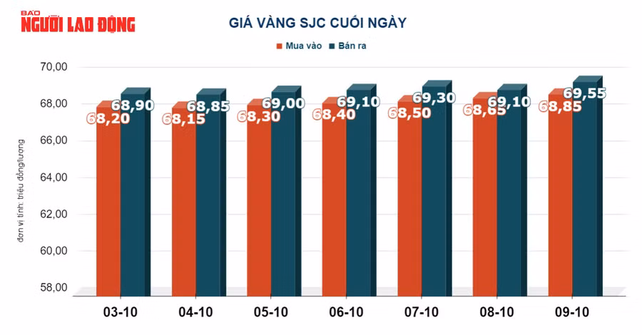 Tại Việt Nam, giá vàng SJC trong ngày 9-10 tăng 50.000 đồng/lượng, chốt cuối ngày tại 69,55 triệu đồng/lượng.