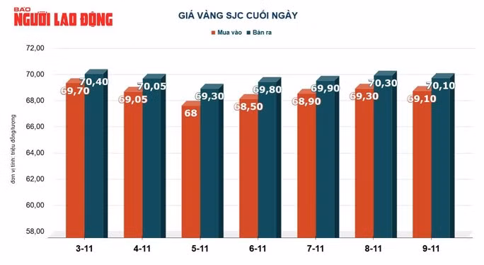 Tại Việt Nam, giá vàng SJC cuối ngày 9-11 giao dịch tại 70,1 triệu đồng/lượng, giảm 100.000 đồng/lượng so với mức giá đầu ngày là 70,2triệu đồng/lượng.