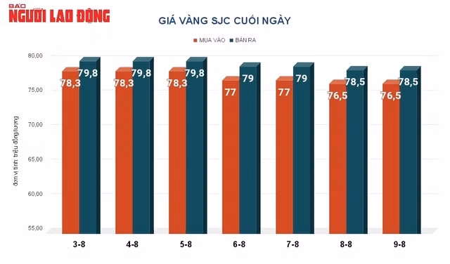 Tại Việt Nam, giá vàng SJC trong ngày 9-8 giữ nguyên 78,5 triệu đồng/lượng. Giá vàng nhẫn do các công ty SJC, PNJ sản xuất bán ra 77,5 triệu đồng/lượng.