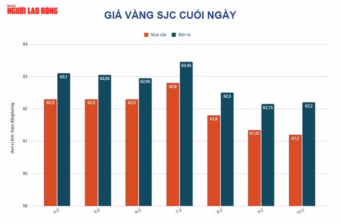 Trước đó tại Việt Nam, giá vàng SJC trong ngày Thần Tài – mùng 10 tháng Giêng (tức 10-2) có lúc vọt lên 62,7 triệu đồng lượng. Ở mức giá này, những người nắm giữ vàng miếng đã ồ ạt bán ra buộc giá vàng SJC giảm sốc 500.000 đồng/lượng, chốt cuối ngày tại 62,2 triệu đồng/lượng, cao hơn giá vàng thế giới 12 triệu đồng/lượng.