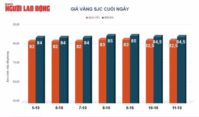 Trước đó, giá vàng SJC tại Việt Nam ngày 11-10 giữ nguyên 84,5 triệu đồng/lượng. Giá vàng nhẫn 82,9 triệu đồng/lượng.