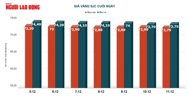Tại Việt Nam, giá vàng SJC cuối ngày 11-12 xuống còn 73,75 triệu đồng/lượng - giảm mạnh 250.000 đồng/lượng so với mức giá đầu ngày là 74 triệu đồng/lượng.
