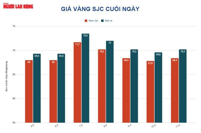 Thực tế cho thấy, lúc 9 giờ ngày 11-3, giá vàng SJC được các doanh nghiệp mua vào 67,9 triệu đồng/lượng, bán ra 69,7 triệu đồng/lượng, tăng thêm 100.000 đồng/lượng so với cuối ngày 10-3 là 69,6 triệu đồng/lượng.