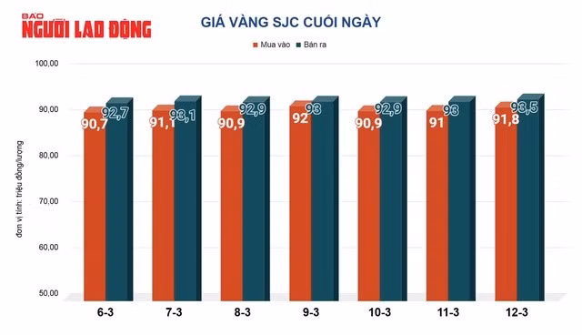 Trước đó, tại Việt Nam, cuối ngày 12-3, giá vàng SJC bán ra lên tới 93,5 triệu đồng/lượng. Giá vàng nhẫn 93,4 triệu đồng/lượng.