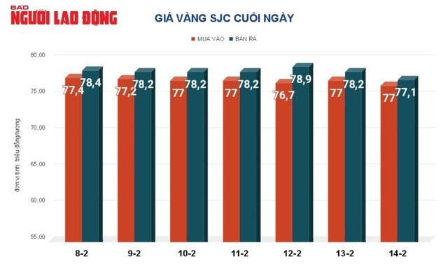 Tại Việt Nam, do sức mua trong ngày 14-2 (mùng 5 Tết) sụt giảm nên giá vàng SJC "bốc hơi" 500.000 đồng/lượng, chốt cuối ngày tại 77,1 triệu đồng/lượng.
