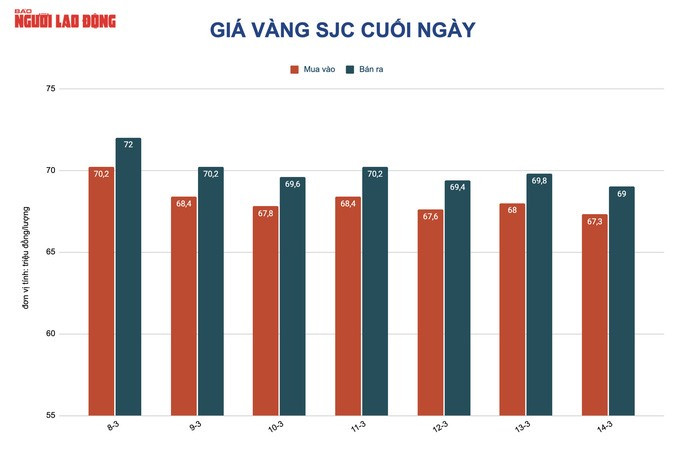 Lúc 17 giờ ngày 14-3, giá vàng SJC được Công ty vàng bạc đá quý Sài Gòn (SJC) mua vào 67,3 triệu đồng/lượng, bán ra 69 triệu đồng/lượng. PNJ mua vào 67,4 triệu đồng /lượng, bán ra 69 triệu đồng/lượng. Bảo Tín Minh Châu (BTMC) mua vào 67 triệu đồng/lượng, bán ra 68,7 triệu đồng/lượng. DOJI mua vào 67 triệu đồng/lượng, bán ra 68,8 triệu đồng/lượng. Công ty Mi Hồng mua vào 67,7 triệu đồng/lượng, bán ra 68,7 triệu đồng/lượng.