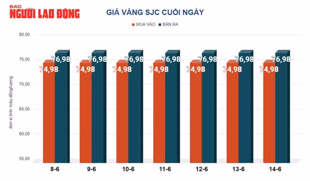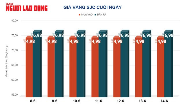 Trước đó, trong ngày 14-6, bốn ngân hàng thương mại (Vietcombank, Agribank, BID, VietinBank) và Công ty SJC giữ nguyên giá vàng SJC tạo 76,98 triệu đồng/lượng. Giá vàng nhẫn do các công ty SJC, PNJ sản xuất có giá 74,5 triệu đồng/lượng.