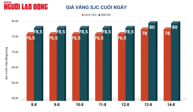 Trước đó, tại Việt Nam, giá vàng SJC trong ngày 14-8 bất động tại 80 triệu đồng/lượng. Giá vàng nhẫn do các công ty SJC, PNJ sản xuất bán ra 77,9 triệu đồng/lượng.