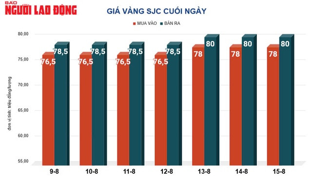 Trước đó, tại Việt Nam, giá vàng SJC trong ngày 15-8 bất động tại 80 triệu đồng/lượng. Giá vàng nhẫn do các công ty SJC, PNJ sản xuất bán ra 77,8 triệu đồng/lượng.