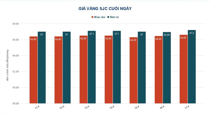 Trước đó, tại Việt Nam, do trong ngày 17-4 giá vàng thế giới đi lên nên giá vàng SJC tăng 250.000 đồng/lượng, chốt cuối ngày tại 67,2 triệu đồng/lượng.