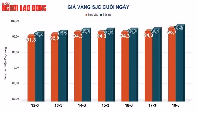 Tại Việt Nam, cuối ngày 18-3, giá vàng SJC bán ra 98,2 triệu đồng/lượng. Giá vàng nhẫn được giới kinh doanh đồng loạt bán ra 98,1 triệu đồng/lượng.