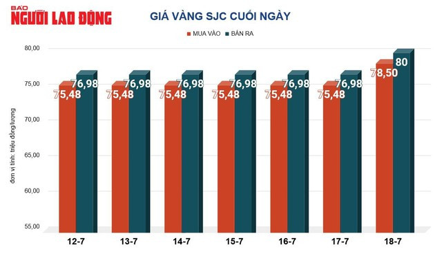 Tại Việt Nam, giá vàng SJC trong ngày 18-7 tăng lên 80 triệu đồng/lượng. Riêng giá vàng nhẫn do các công ty SJC, PNJ sản xuất có giá 77,6 triệu đồng/lượng, cao hơn giá vàng thế giới khoảng 1 triệu đồng/lượng.