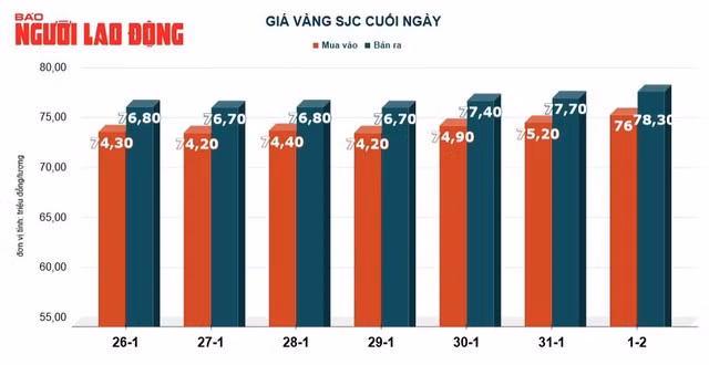 Tại Việt Nam, do giá vàng thế giới nóng lên, sức mua trong nước gia tăng nên giá vàng SJC trong ngày 1-2 tăng 300.000 đồng/lượng, chốt cuối ngày tại 78,3 triệu đồng/lượng.