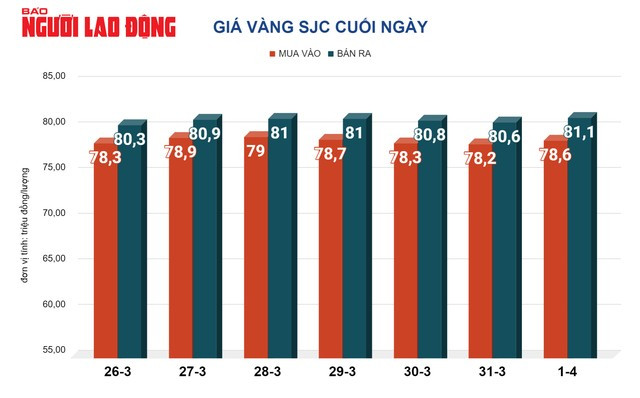 Trước đó, tại Việt Nam, giá vàng SJC trong ngày 1-4 tăng 100.000 đồng/lượng, chốt cuối ngày tại 81,1 triệu đồng/lượng.