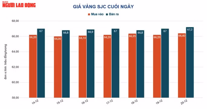 Trước đó, do giá vàng thế giới tăng nên trong ngày 20-12, giá vàng SJC tăng 300.000 đồng/lượng, chốt cuối ngày tại 67,2 triệu đồng/lượng.