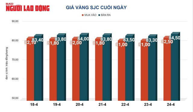 Tại Việt Nam, sáng 25-4, Ngân hàng Nhà nước tiếp tục bán đấu thầu 16.800 lượng vàng miếng SJC. Trước đó, giá vàng SJC trong ngày 24-4 bất ngờ tăng 700.000 đồng/lượng, chốt cuối ngày tại 84,5 triệu đồng/lượng.