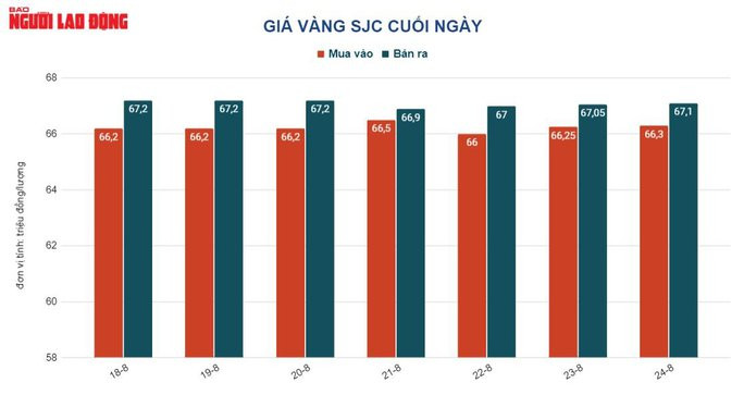 Trước đó, trong ngày 24-8, do thị trường gần như không có người giao dịch nên giá vàng SJC bất động tại 67,1 triệu đồng/lượng. Riêng giá vàng nhẫn, giá vàng trang sức tăng 100.000 đồng/lượng, giao dịch quanh mức 51,8 triệu đồng /lượng mua vào, 52,8 triệu đồng/lượng bán ra.