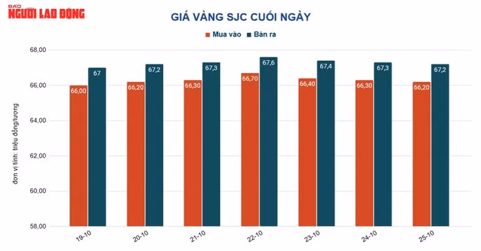 Trước đó, trong ngày 25-10, do sức mua yếu nên đến cuối ngày, giá vàng SJC gần như bất động tại 67,2 triệu đồng/lượng.