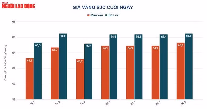 Trước đó, do giá vàng thế giới đi lên từ 9 giờ đến 17 giờ ngày 25-7, cộng với sức mua khởi sắc nên giá vàng SJC tăng 300.000 đồng/lượng, chốt cuối ngày tại 66,5 triệu đồng/lượng.
