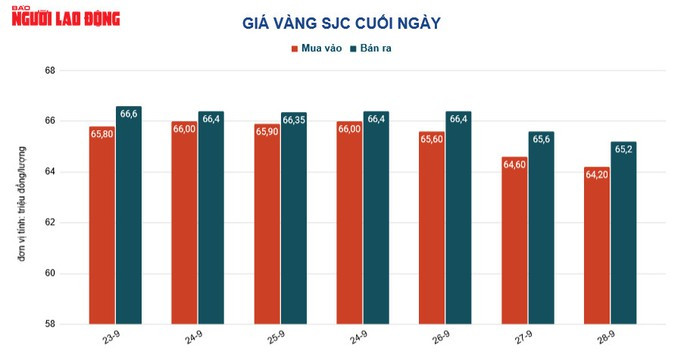 Trước đó, từ 9 giờ đến 17 giờ ngày 28-9, do giá vàng thế giới từ 1.630 USD/ounce xuống còn 1.614 USD/ounce, cộng với động thái bán ra của giới đầu cơ trong nước nên giá vàng SJC có lúc giảm gần 2 triệu đồng/lượng, chốt cuối ngày tại 65,2 triệu đồng/lượng.