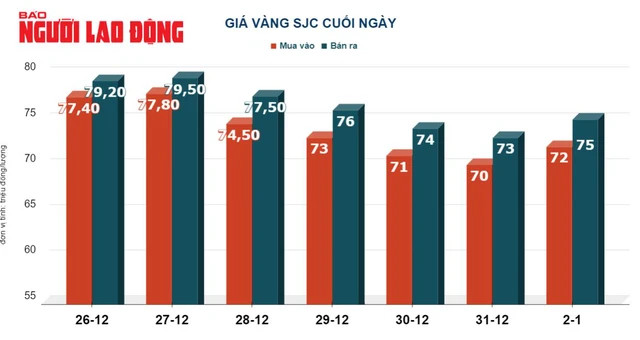 Tại Việt Nam, giá vàng SJC biến động rất mạnh. Cụ thể, vào đầu ngày 2-1, vàng miếng SJC bán ra 74,5 triệu đồng/lượng nhưng chỉ vài giờ tiếp theo đã tăng lên 76 triệu đồng/lượng. Sau đó, giá vàng SJC bất ngờ đảo chiều giảm 1 triệu đồng và đến cuối ngày giao dịch tại 75 triệu đồng/lượng.