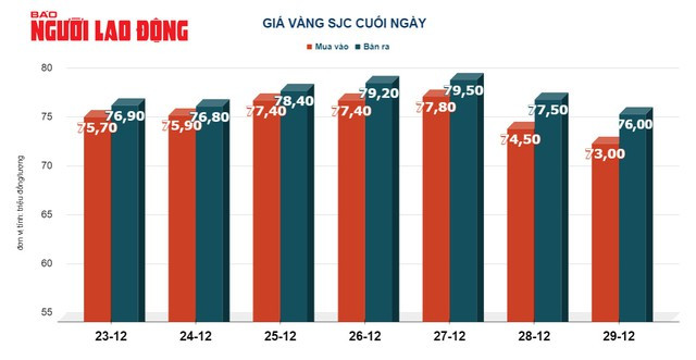 Đến cuối ngày 29-12, giá vàng SJC bán ra 76 triệu đồng/lượng, mua vào 73 triệu đồng/lượng.