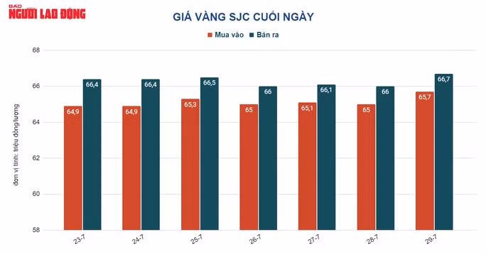 Trước đó, do từ 9 giờ đến 17 giờ ngày 29-7 giá vàng thế giới tăng mạnh nên trong khoảng thời gian này giá vàng SJC tăng 500.000 đồng/lượng, chốt cuối ngày tại 66,7 triệu đồng/lượng.