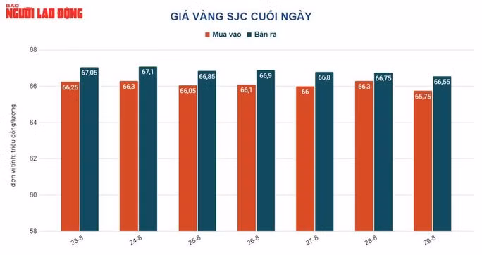 Trước đó, vào cuối ngày 29-8, do sức mua yếu nên giá vàng SJC giảm thêm 150.000 đồng/lượng, chốt cuối ngày ở 66,55 triệu đồng/lượng sau khi đã giảm 200.000 đồng/lượng. Tính ra hôm qua, giá vàng SJC đã giảm tổng cộng 350.000 đồng/lượng.