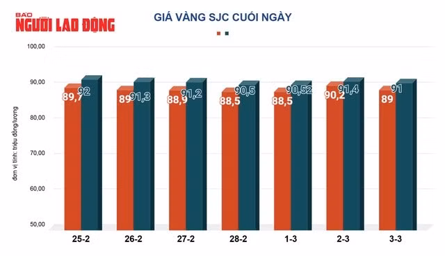 Trước đó, tại Việt Nam, trong ngày 3-3, giá vàng SJC bán ra 91 triệu đồng/lượng; giá vàng nhẫn 90,9 triệu đồng/lượng.