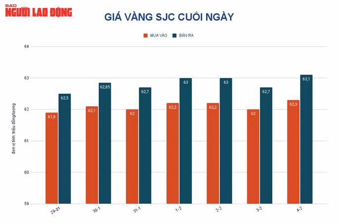 Trước đó, tại Việt Nam, giá vàng SJC ngày 4-2 tăng 200.000 đồng/lượng, chốt cuối ngày tại mức 62,7 triệu đồng/lượng. Như thế, giá vàng trong nước cao hơn giá vàng thế giới quy đổi gần 13 triệu đồng/lượng. Riêng giá vàng nhẫn tăng 100.000 đồng/lượng, giao dịch quanh mức 53,8 triệu đồng/lượng.