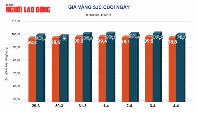 Trước đó, tại Việt Nam, cuối ngày 4-4, giá vàng SJC bán ra ở mức 101,3 triệu đồng/lượng, trong khi giá vàng nhẫn bán ra ở mức 101,2 triệu đồng/lượng.