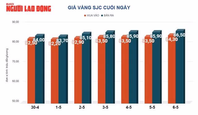 Trước đó, trong ngày 6-5, giá vàng SJC tăng 500.000 đồng/lượng, chốt cuối ngày tại lên 86,5 triệu đồng/lượng. Giá vàng nhẫn do Công ty SJC sản xuất có giá bán ra 75,05 triệu đồng/lượng.
