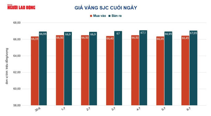 Tại Việt Nam, trong ngày 6-7, giá vàng SJC tăng 50.000 đồng/lượng, chốt cuối ngày tại 67,05 triệu đồng/lượng.
