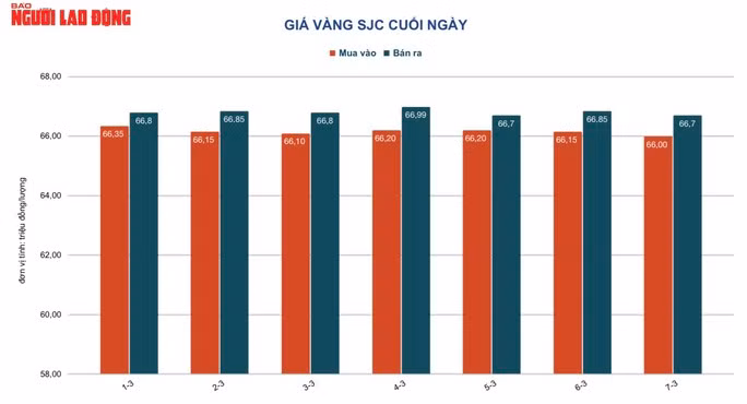Trước đó, tại Việt Nam, do từ 9 giờ đến 17 giờ ngày 7-3 giá vàng thế giới chưa giảm mạnh nên trong khoảng thời gian này, giá vàng SJC chỉ giảm 50.000 đồng/lượng, chốt cuối ngày tại 66,7 triệu đồng/lượng.