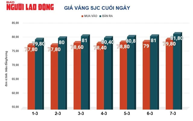 Trước đó, tại Việt Nam, giá vàng SJC trong ngày 7-3 cũng nóng lên với mức tăng tới 800.000 đồng/lượng, chốt cuối ngày tại 81,8 triệu đồng/lượng.