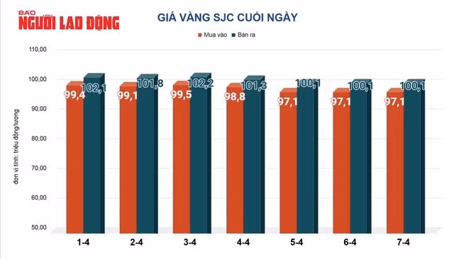 Tại thị trường trong nước, ngày 7-4, giá vàng SJC được bán ra ở mức 101,1 triệu đồng/lượng, trong khi giá vàng nhẫn bán ra ở mức 100 triệu đồng/lượng.
